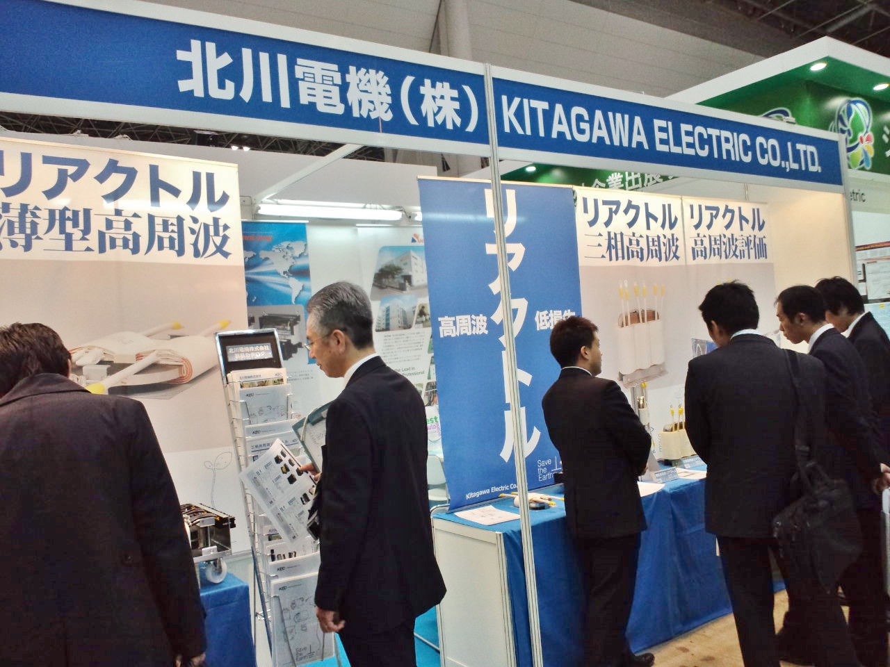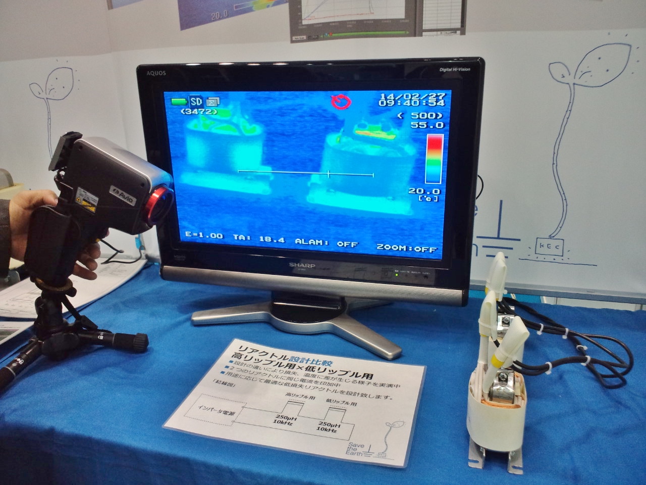 それに伴い、展示方法や展示品なども大幅にリニューアル致しました。 従来は弊社の得意な「トランス」をアピールしておりましたが、 現在開発に力を入れている「薄型・高周波リアクトル」を全面にアピールしました。 特に皆様の注目を集めていたのが、サーモグラフィによる実演展示です。 二つのリアクトルを直列に接続し、同じインバータの電流波形を流します。 ある1点を除けば全く同じリアクトルですが、損失や温度に段々と差が生じ始めます。 写真は設営準備中のものですが、変化が目で見てわかるので面白いようです。 弊社では、お客様の用途に応じて最適な低損失リアクトルをカスタム設計致します。 もちろん、トランスに関しても同様に対応致しますので、お気軽にお問い合わせください。 この度はたくさんの方々にお越しいただき、誠にありがとうございました。