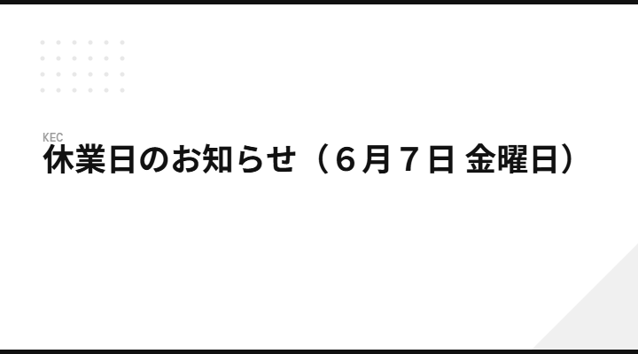 この度弊社では、誠に勝手ながら下記日程を休業日とさせていただきますので、 ご承知おきくださいますようお願い申し上げます。 2019年6月7日(金) 尚、10日(月)からは通常営業になります。
