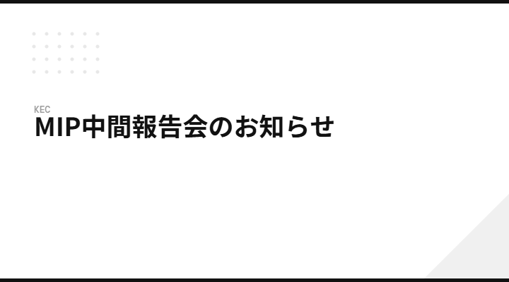 8月7日(金)午後3時より、営業課、製造課、開発設計課及び製造管理課の それぞれが定めた2015年度の活動目標について中間報告を行います。 MIPとは、「Management Innovation Project / 経営革新計画」のことを指す弊社オリジナルの言葉です。 (MIP発表会とは?) 尚、主なスケジュールは以下の通りです。 15:10 社長によるMIP概要説明 15:20 営業目標チーム発表 15:50 開発目標チーム発表 16:20 製造目標チーム発表 16:50 品質目標チーム発表 17:20 終了予定 会期中は全社業務停止等、皆様に何かとご迷惑をお掛け致しますが、 何卒ご理解とご協力をいただけますようお願い申し上げます。 (前回の経営革新計画(MIP)の社内報告会についての詳細はこちらをご参照ください)。